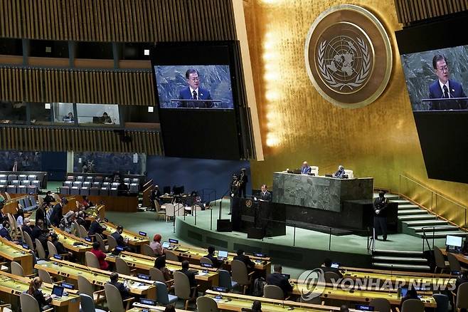 (뉴욕=연합뉴스) 최재구 기자 = 문재인 대통령이 21일(현지시각) 미국 뉴욕 유엔 총회장에서 기조연설을 하고 있다. 2021.9.22