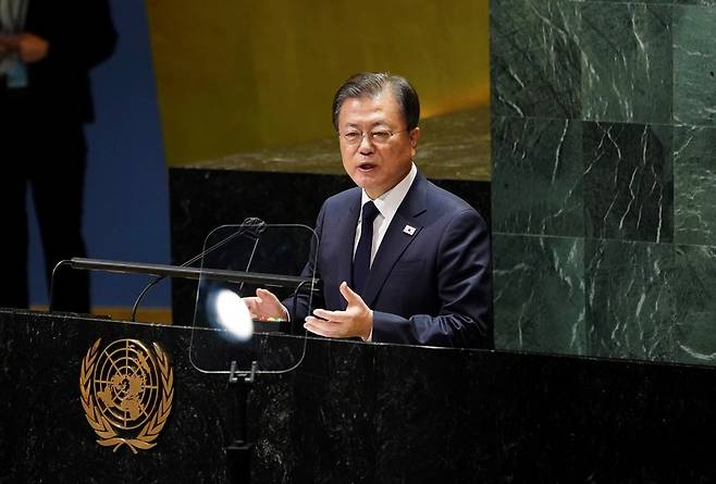 문재인 대통령이 21일(현지시각) 미국 뉴욕 유엔 총회장에서 기조연설을 하고 있다 (뉴욕=연합뉴스)