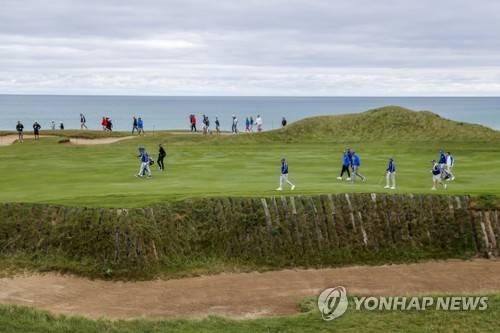 epa09480305 European team members walk up the eleventh hole during a practice round for the pandemic-delayed 2020 Ryder Cup golf tournament at the Whistling Straits golf course in Kohler, Wisconsin, USA, 21 September 2021. Competition for the 43rd Ryder Cup between the US and Europe begins 24 September 2021. EPA/ERIK S. LESSER