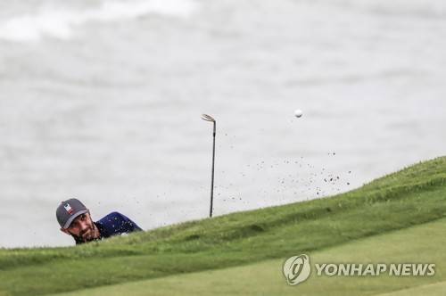 epa09480412 US team member Dustin Johnson hits from a sand trap by the seventh green, next to Lake Michigan, during practice for the pandemic-delayed 2020 Ryder Cup golf tournament at the Whistling Straits golf course in Kohler, Wisconsin, USA, 21 September 2021. Competition for the 43rd Ryder Cup between the US and Europe begins 24 September 2021. EPA/TANNEN MAURY
