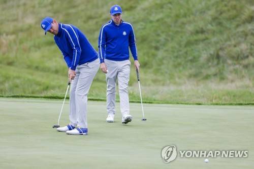 epa09480404 European team member Bernd Wiesberger (L) of Austria and European team member Matt Fitzpatrick (R) of England on the twelfth hole during a practice round for the pandemic-delayed 2020 Ryder Cup golf tournament at the Whistling Straits golf course in Kohler, Wisconsin, USA, 21 September 2021. Competition for the 43rd Ryder Cup between the US and Europe begins 24 September 2021. EPA/ERIK S. LESSER
