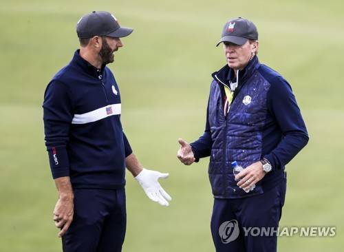 epa09480452 US Team Captain Steve Stricker (R) talks with US team member Dustin Johnson (L) during practice for the pandemic-delayed 2020 Ryder Cup golf tournament at the Whistling Straits golf course in Kohler, Wisconsin, USA, 21 September 2021. Competition for the 43rd Ryder Cup between the US and Europe begins 24 September 2021. EPA/TANNEN MAURY