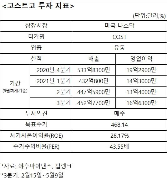 코스트코를 향한 월가의 평가도 긍정적이다. 투자 전문매체 팁랭크스에 따르면 최근 3개월 간 17명의 애널리스트 중 13명이 코스트코에 대해 매수를 추천했다. 4명은 중립이었다. 목표주가의 평균치는 468.14달러였다.