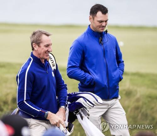 epa09480486 Caddie John McLaren (L) walks off the sixteenth tee with European Team Vice captain Martin Kaymer of Germany (R) during practice for the pandemic-delayed 2020 Ryder Cup golf tournament at the Whistling Straits golf course in Kohler, Wisconsin, USA, 21 September 2021. Competition for the 43rd Ryder Cup between the US and Europe begins 24 September 2021. EPA/TANNEN MAURY