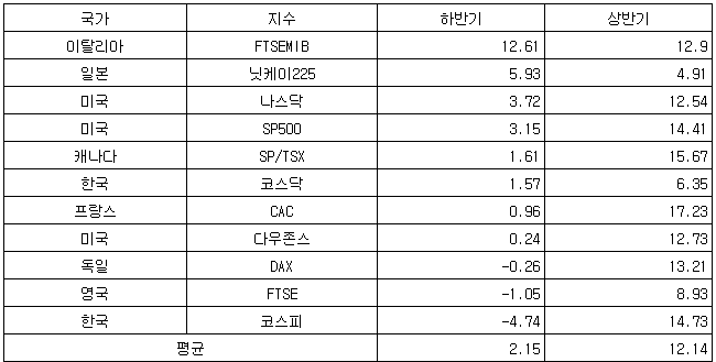 이탈리아(FTSEMIB)가 하반기 12.61%의 상승률을 보이며 G7 중 가장 높았던 것과 비교하면 코스피는 17%포인트 이상 차이가 난다.