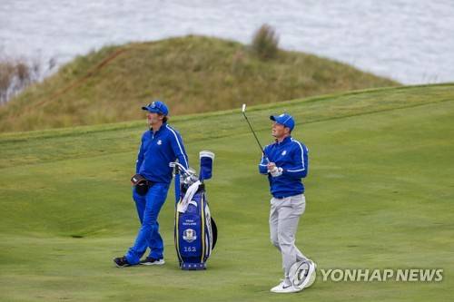 epa09480513 European team member Viktor Hovland (R) of Norway on the thirteenth hole during a practice round for the pandemic-delayed 2020 Ryder Cup golf tournament at the Whistling Straits golf course in Kohler, Wisconsin, USA, 21 September 2021. Competition for the 43rd Ryder Cup between the US and Europe begins 24 September 2021. EPA/ERIK S. LESSER