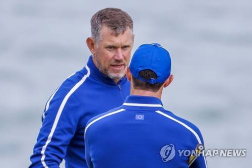 epa09480539 European team member Lee Westwood (L) of England speaks with Rory McElroy (R) of Northern Ireland on the thirteenth hole during a practice round for the pandemic-delayed 2020 Ryder Cup golf tournament at the Whistling Straits golf course in Kohler, Wisconsin, USA, 21 September 2021. Competition for the 43rd Ryder Cup between the US and Europe begins 24 September 2021. EPA/ERIK S. LESSER