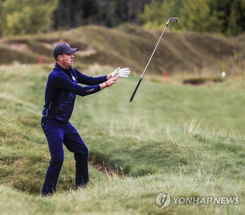 epa09480540 US team member Justin Thomas catches his club as it is tossed by his caddie on the fifth hole during practice for the pandemic-delayed 2020 Ryder Cup golf tournament at the Whistling Straits golf course in Kohler, Wisconsin, USA, 21 September 2021. Competition for the 43rd Ryder Cup between the US and Europe begins 24 September 2021. EPA/TANNEN MAURY