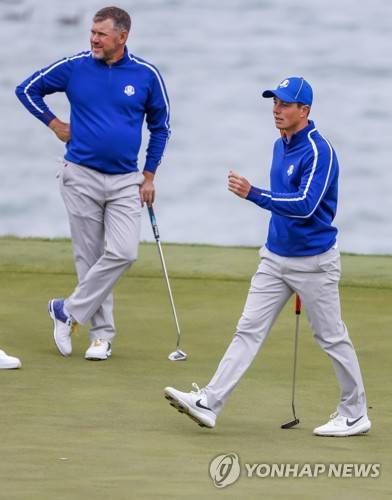 epa09480541 European team members Viktor Hovland (R) of Norway and Lee Westwood (L) of England on the thirteenth hole during a practice round for the pandemic-delayed 2020 Ryder Cup golf tournament at the Whistling Straits golf course in Kohler, Wisconsin, USA, 21 September 2021. Competition for the 43rd Ryder Cup between the US and Europe begins 24 September 2021. EPA/ERIK S. LESSER