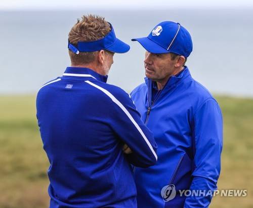 epa09480593 European Team Captain Padraig Harrington (R) talks with European team member Ian Poulter of England (L) on the seventeenth tee during practice for the pandemic-delayed 2020 Ryder Cup golf tournament at the Whistling Straits golf course in Kohler, Wisconsin, USA, 21 September 2021. Competition for the 43rd Ryder Cup between the US and Europe begins 24 September 2021. EPA/TANNEN MAURY