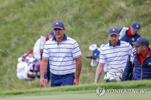 epa09480616 US team members Brooks Koepka (L) and Daniel Berger (R) on the twelfth hole during a practice round for the pandemic-delayed 2020 Ryder Cup golf tournament at the Whistling Straits golf course in Kohler, Wisconsin, USA, 21 September 2021. Competition for the 43rd Ryder Cup between the US and Europe begins 24 September 2021. EPA/ERIK S. LESSER