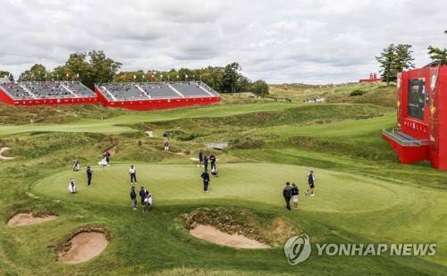 epa09480634 Golfers on the US team putt on the ninth green during practice for the pandemic-delayed 2020 Ryder Cup golf tournament at the Whistling Straits golf course in Kohler, Wisconsin, USA, 21 September 2021. Competition for the 43rd Ryder Cup between the US and Europe begins 24 September 2021. EPA/TANNEN MAURY