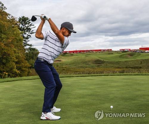epa09480647 US team member Xander Schauffele hits a tee shot on the tenth hole during practice for the pandemic-delayed 2020 Ryder Cup golf tournament at the Whistling Straits golf course in Kohler, Wisconsin, USA, 21 September 2021. Competition for the 43rd Ryder Cup between the US and Europe begins 24 September 2021. EPA/TANNEN MAURY