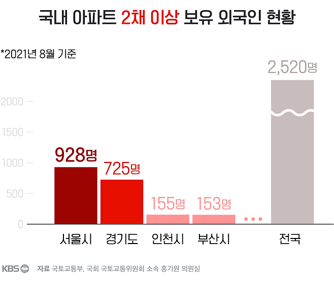 국회 국토교통위원회 소속 홍기원 의원실이 한국부동산원에서 받은 자료에 따르면 국내 아파트를 2채 이상 보유한 외국인은 지난달(8월) 기준 2,500명이 넘습니다.