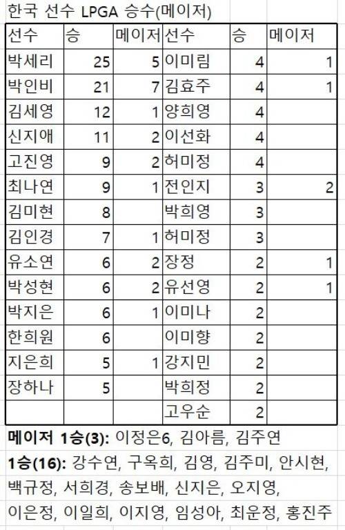 박세리를 비롯해 48명의 선수가 메이저 34승에 198승을 쌓아올렸다. 박세리가 승수에서는 25승에 메이저 5승으로 가장 많으며, 박인비는 승수는 21승이지만 메이저에서 가장 많은 7승을 올렸다. 김세영이 12승에 메이저 1승, 지금은 일본에서 활동하는 신지애가 11승에 메이저 2승을 올렸다. 고진영과 최나연은 9승씩이다.