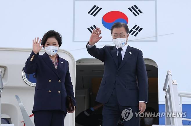 (뉴욕=연합뉴스) 최재구 기자 = 문재인 대통령과 김정숙 여사가 21일(현지시각) 미국 JFK 국제공항에서 하와이로 떠나기 위해 공군1호기에 올라 손을 흔들어 인사하고 있다. 2021.9.22