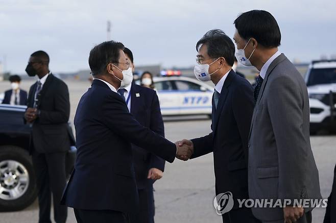 (뉴욕=연합뉴스) 최재구 기자 = 문재인 대통령이 21일(현지시각) 미국 JFK 국제공항에서 하와이로 떠나기 위해 공군1호기로 향하며 조현 주유엔 대사와 인사하고 있다. 2021.9.22