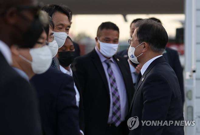 (뉴욕=연합뉴스) 최재구 기자 = 문재인 대통령이 21일(현지시각) 미국 JFK 국제공항에서 하와이로 떠나기 앞서 조현 주유엔대사의 환송을 받고 있다. 2021.9.22