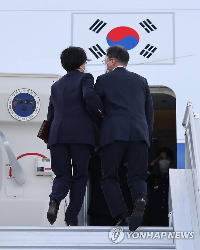(뉴욕=연합뉴스) 최재구 기자 = 문재인 대통령과 김정숙 여사가 21일(현지시각) 미국 JFK 국제공항에서 하와이로 떠나기 위해 공군1호기에 오르고 있다. 2021.9.22