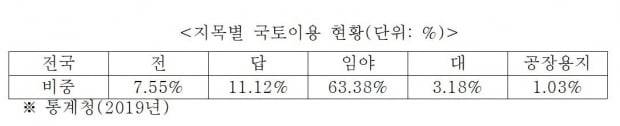 도시의 면적이 넓다는 것은 총량적으로 활용할 수 있는 토지가 많다는 의미입니다. 하지만 안타깝게도 산과 하천이 많은 우리나라에서는 건물을 지을 수 있는 땅(垈地)의 면적이 그리 넓지 않습니다. 2019년을 기준으로 전국의 대지면적 비중은 3.18%에 불과합니다. 임야의 비중이 대부분인데 놀라지 마십시오. 무려 63.3%나 됩니다. 물론 전, 답이나 임야에도 건물을 지을 수는 있지만 토지의 활용도 면에서 본다면 대지와는 비교가 되지 않습니다.