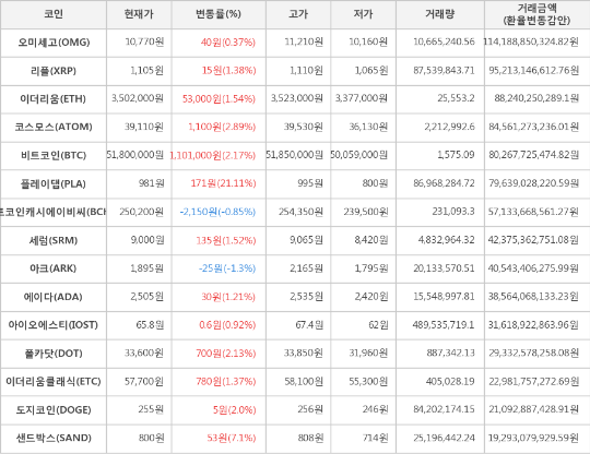 또한, 샌드박스(7.1%, 800원), 코스모스(2.89%, 39,110원), 폴카닷(2.13%, 33,600원), 도지코인(2.0%, 255원), 이더리움(1.54%, 3,502,000원), 세럼(1.52%, 9,000원), 리플(1.38%, 1,105원), 이더리움클래식(1.37%, 57,700원), 에이다(1.21%, 2,505원), 아이오에스티(0.92%, 65.8원), 오미세고(0.37%, 10,770원)가 상승세를 나타냈다.