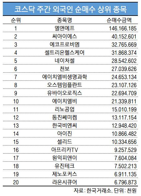 코스닥 주간 외국인 순매수 1위 '엘앤에프'