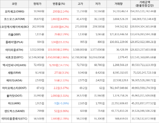 또한, 엑시인피니티(14.71%, 72,450원), 샌드박스(6.96%, 799원), 코스모스(4.89%, 39,870원), 비트코인캐시에이비씨(4.2%, 262,950원), 아이오에스티(3.37%, 67.4원), 폴카닷(3.31%, 33,990원), 세럼(3.1%, 9,140원), 이더리움(2.99%, 3,552,000원), 이더리움클래식(2.78%, 58,500원), 리플(2.29%, 1,115원), 에이다(2.22%, 2,530원), 오미세고(2.14%, 10,960원)가 상승세를 나타냈다.
