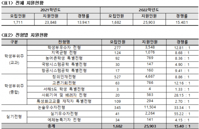(지디넷코리아=방은주 기자)세종대학교(총장 배덕효)는 2022학년도 수시모집 원서접수를 마감한 결과 1682명 모집에 2만5903명이 지원해 평균 15.40:1의 경쟁률을 기록했다고 밝혔다.