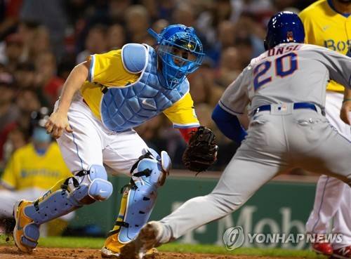 epa09480897 Boston Red Sox catcher Christian Vazquez (L) prepare to tag out New York Mets' Pete Alonso (R) during the fourth inning at Fenway Park in Boston, Massachusetts, USA, 21 September 2021. EPA/CJ GUNTHER