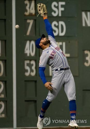 epa09480898 New York Mets left fielder Kevin Pillar can not field the ball during the fourth inning against the Boston Red Sox at Fenway Park in Boston, Massachusetts, USA, 21 September 2021. EPA/CJ GUNTHER