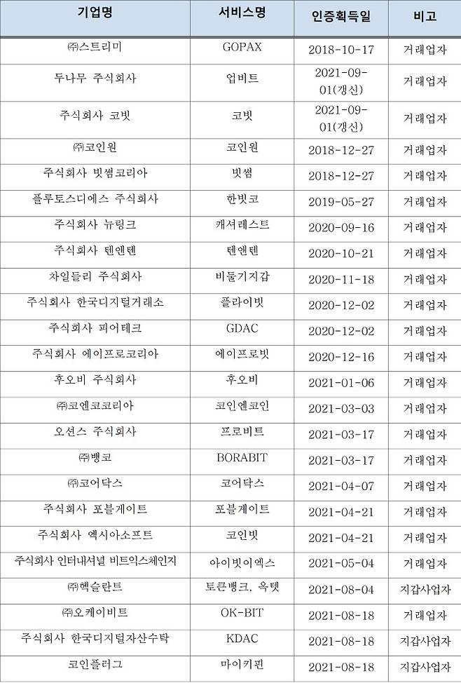 특금법(특정 금융거래정보의 보고 및 이용 등에 관한 법률) 신고기한인 9월 24일 이전에 사실상 최종적인 정보보호 관리체계(ISMS) 인증 사업자 명단이 공개됐다.