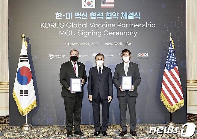 (서울=뉴스1) = 문재인 대통령이 21일(현지시각) 미국 뉴욕 JW메리어트 호텔에서 열린 한미 백신 협력 협약 체결식에서 MOU 체결한 후 타일러 마틴 Adjuvance Tech 대표(왼쪽), 최석근 유바이오로직스 대표와 기념촬영을 하고 있다. (청와대 제공) 2021.9.22/뉴스1