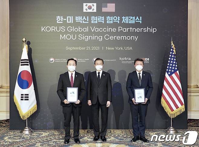 (서울=뉴스1) = 문재인 대통령이 21일(현지시각) 미국 뉴욕 JW메리어트 호텔에서 열린 한미 백신 협력 협약 체결식에서 MOU 체결한 후 찰스리 잭슨연구소 유전체의학 연구소장(왼쪽), 성제경 국가마우스표현형사업단장과 기념촬영을 하고 있다. (청와대 제공) 2021.9.22/뉴스1