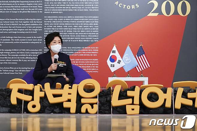 (서울=뉴스1) = 제76차 유엔총회를 계기로 문재인 대통령과 함께 미국 뉴욕을 방문 중인 김정숙 여사가 21일(현지시각) 미국 뉴욕한국문화원에서 열린 차세대 한인 청년 간담회에서 인사말을 하고 있다. (청와대 제공) 2021.9.22/뉴스1