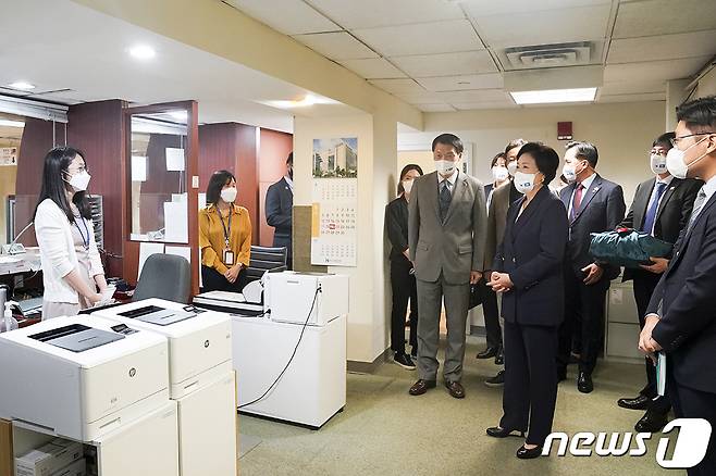 (서울=뉴스1) = 제76차 유엔총회를 계기로 문재인 대통령과 함께 미국 뉴욕을 방문 중인 김정숙 여사가 21일(현지시각) 미국 뉴욕총영사관 민원실을 방문해 직원들을 격려하고 있다. (청와대 제공) 2021.9.22/뉴스1