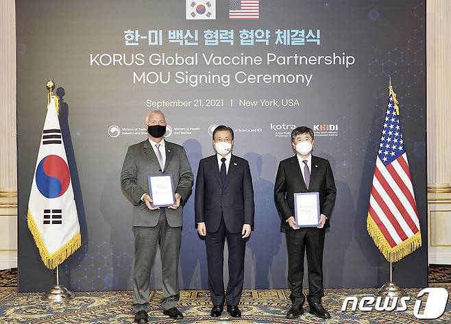 (서울=뉴스1) = 문재인 대통령이 21일(현지시각) 미국 뉴욕 JW메리어트 호텔에서 열린 한미 백신 협력 협약 체결식에서 MOU 체결한 후 제프 휘트모어 Trilink 부사장(왼쪽), 조양제 아이진 기술총괄 대표과 기념촬영을 하고 있다. (청와대 제공) 2021.9.22/뉴스1