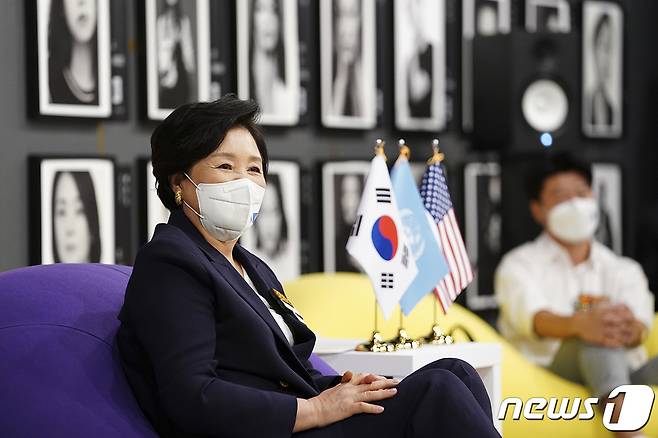 (서울=뉴스1) = 제76차 유엔총회를 계기로 문재인 대통령과 함께 미국 뉴욕을 방문 중인 김정숙 여사가 21일(현지시각) 미국 뉴욕한국문화원에서 열린 차세대 한인 청년 간담회에서 참석자의 발언을 듣고 있다. (청와대 제공) 2021.9.22/뉴스1
