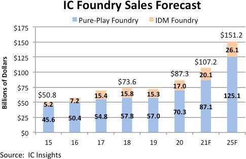 IC인사이츠는 또 파운드리 시장이 2025년까지 연평균 11.6%의 강력한 성장률을 이어가며 오는 2025년에는 1512억 달러(약 179조원)에 이를 것으로 예측했다.