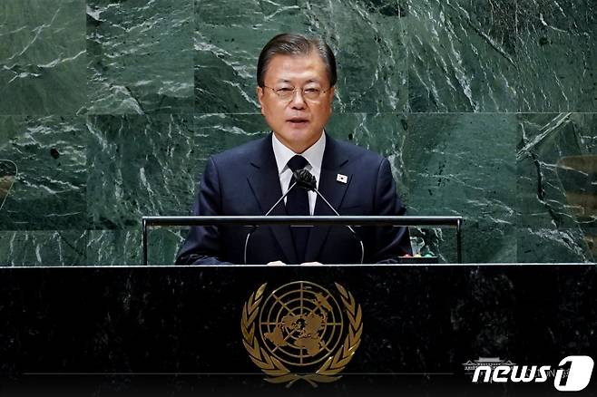 (서울=뉴스1) = 문재인 대통령이 21일(현지시각) 미국 뉴욕 유엔 총회장에서 기조연설을 하고 있다. (청와대 페이스북) 2021.9.22/뉴스1