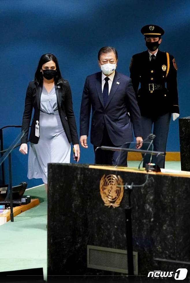 (서울=뉴스1) = 문재인 대통령이 21일(현지시각) 미국 뉴욕 유엔 총회장에 들어서고 있다. (청와대 페이스북) 2021.9.22/뉴스1