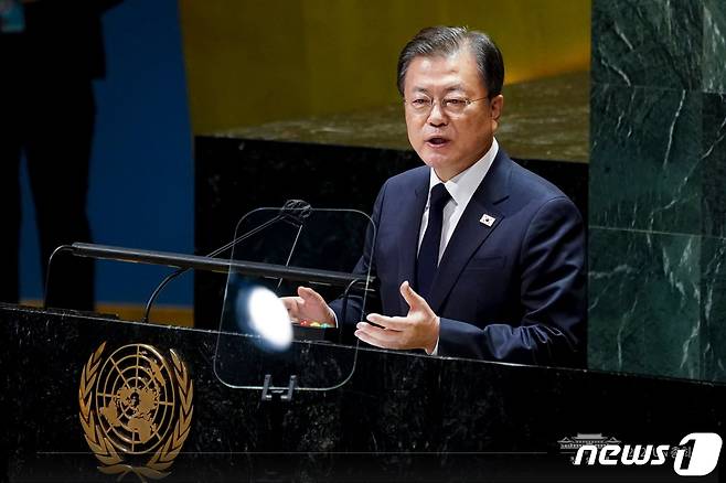 (서울=뉴스1) = 문재인 대통령이 21일(현지시각) 미국 뉴욕 유엔 총회장에서 기조연설을 하고 있다. (청와대 페이스북) 2021.9.22/뉴스1