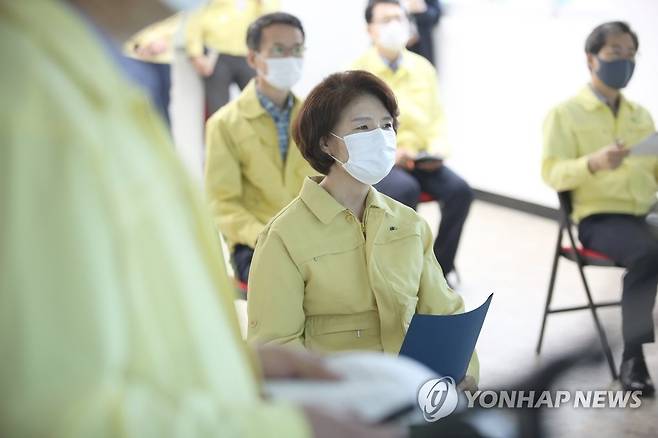 (서울=연합뉴스) 한정애 환경부 장관이 22일 오전 서울 성동구에 위치한 공공선별장을 방문해 성동구청 관계자로부터 추석 연휴 기간 폐기물 수거·선별 처리 현황에 대한 설명을 듣고 있다. 2021.9.22