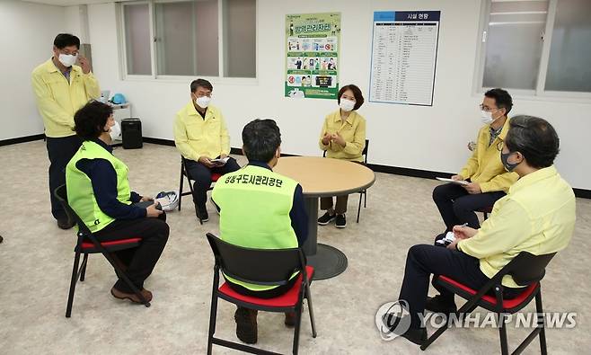 (서울=연합뉴스) 한정애 환경부 장관이 추석 연휴 마지막 날인 22일 오전 서울 성동구에 위치한 공공선별장을 방문해 현장 관계자에게 재활용품 수거에 관련한 당부의 말을 하고 있다. 2021.9.22