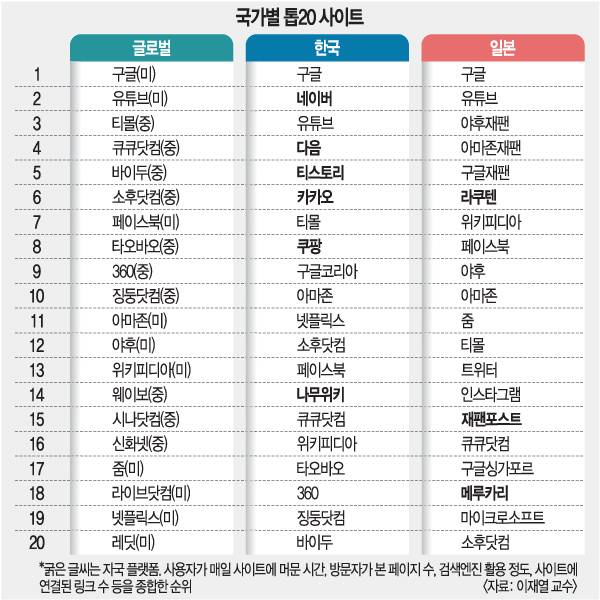 “국가별로 사용자들이 많이 사용하는 사이트를 20위까지 정리해봤다. 글로벌 톱20을 미국과 중국 플랫폼이 각각 10개씩 정확하게 양분했다. G2가 완전히 장악한 것이다. 미국과 중국은 1위부터 20위까지 전부 자국 플랫폼이 휩쓸었다. 일본은 20위 안에 라쿠텐과 재팬포스트, 메루카리 3개가 올라있고, 독일은 자국 사이트가 5개 있지만 기축이 아닌 부문별 플랫폼이었다. 한국은 네이버가 2위, 다음이 4위, 티스토리가 5위, 카카오가 6위, 쿠팡이 8위로 10위 안에 5개의 토종 플랫폼이 들어가 있었다. 글로벌 플랫폼에 안방을 모두 내주지 않은 것이다.”