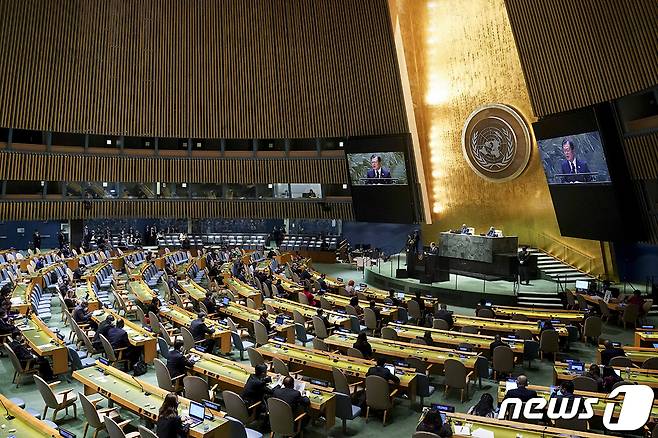 (서울=뉴스1) = 문재인 대통령이 21일(현지시각) 미국 뉴욕 유엔 총회장에서 기조연설을 하고 있다. (청와대 제공) 2021.9.22/뉴스1