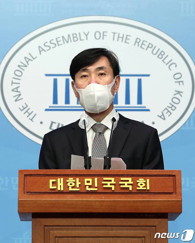 (서울=뉴스1) 구윤성 기자 = 국민의힘 대선 예비후보인 하태경 의원이 22일 오후 서울 국회 소통관에서 최저임금 관련 공약을 발표하고 있다. 하 의원은 대통령 임기 내 최저임금 동결하겠다는 공약을 내세웠다. 2021.9.22/뉴스1