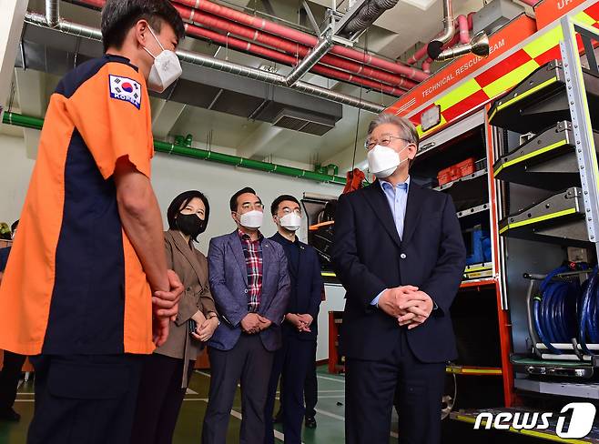(서울=뉴스1) 국회사진취재단 = 더불어민주당 대선 예비후보인 주자인 이재명 경기도지사가 22일 서울 동작소방서를 찾아 소방관들을 격려하고 있다. 2021.9.22/뉴스1