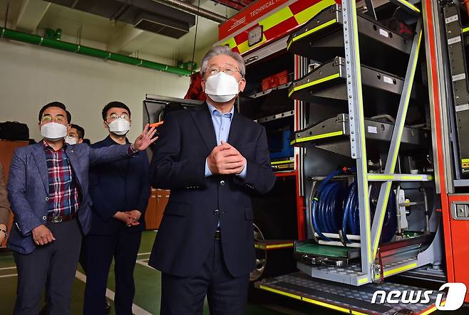 (서울=뉴스1) 국회사진취재단 = 더불어민주당 대선주자인 이재명 경기도지사가 추석 연휴 마지막 날인 22일 서울 동작소방서를 찾아 시설을 둘러보고 있다. 2021.9.22/뉴스1