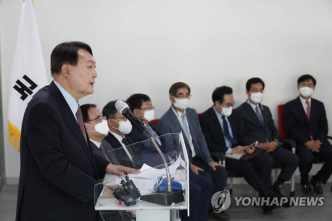 (서울=연합뉴스) 진성철 기자 = 국민의힘 대권주자인 윤석열 전 검찰총장이 22일 서울 여의도 국민의힘 중앙당사에서 외교안보 관련 공약을 발표하고 있다. 왼쪽부터 윤 전 총장, 김성한 고려대 국제대학원 교수, 홍규덕 숙명여대 교수, 백승주 국민캠프 안보정책본부장, 김용현 전 합참 작전본부장, 이도훈 전 외교부 한반도평화교섭본부장, 박철희 서울대 국제대학원 교수, 신범철 경제사회연구원 외교안보센터장. 2021.9.22 [국회사진기자단]