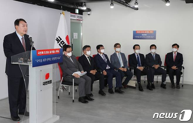 (서울=뉴스1) 구윤성 기자 = 국민의힘 대선 예비후보인 윤석열 전 검찰총장이 22일 오후 서울 여의도 국민의힘 중앙당사에서 외교안보 관련 공약을 발표하고 있다. 이날 공약발표 기자회견에는 윤석열 캠프의 외교안보 정책자문단이 함께 자리했다. 왼쪽부터 김성한 고려대 국제대학원 교수, 홍규덕 숙명여대 교수, 백승주 국민캠프 안보정책본부장, 김용현 전 합참 작전본부장, 이도훈 전 외교부 한반도평화교섭본부장, 박철희 서울대 국제대학원 교수, 신범철 경제사회연구원 외교안보센터장. 2021.9.22/뉴스1